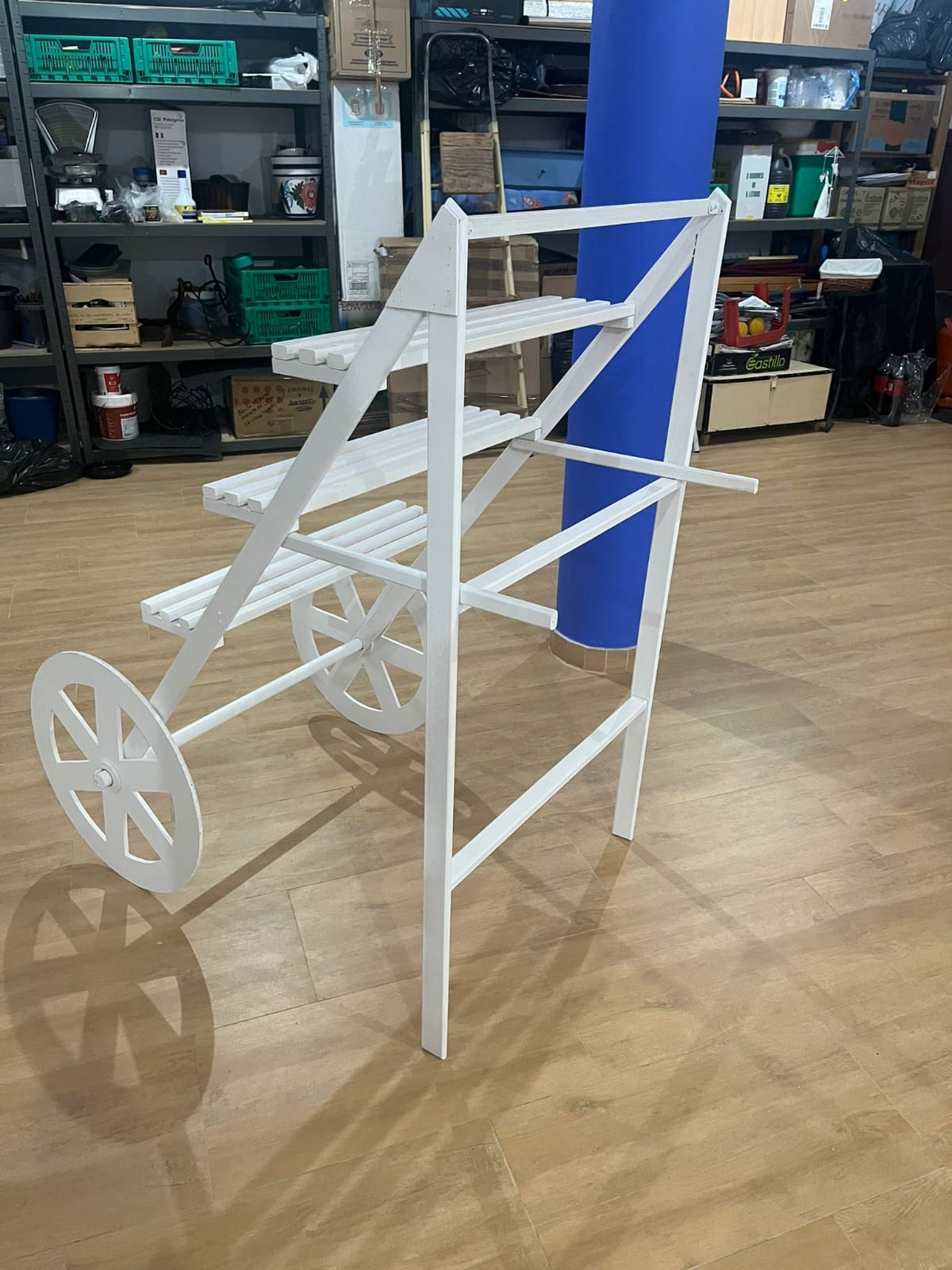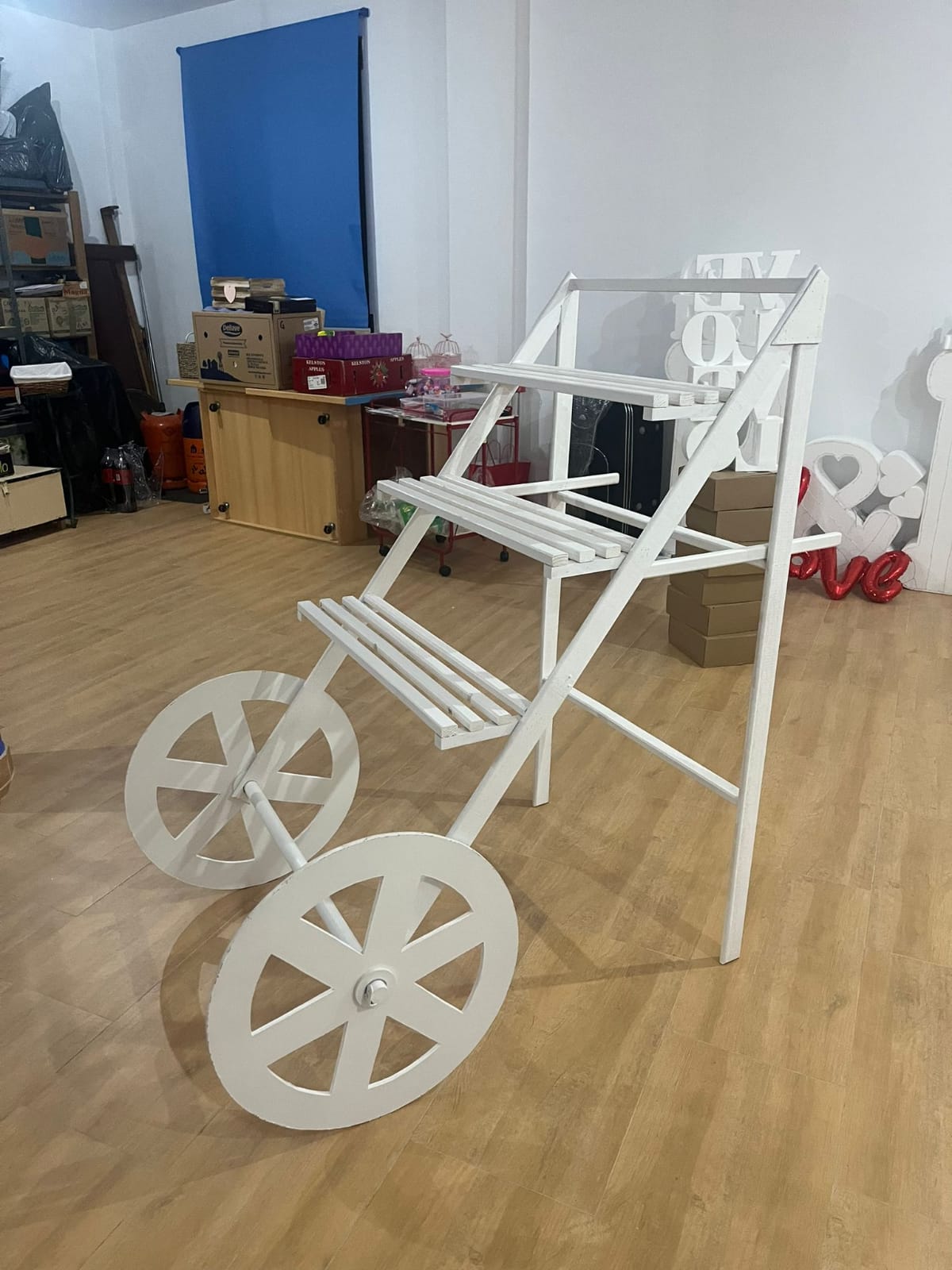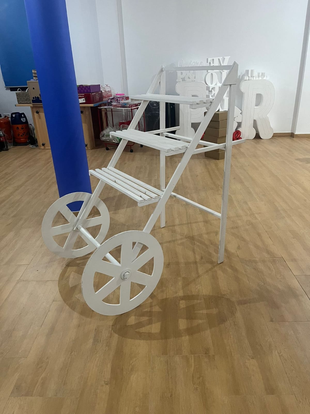 Carro decorativo de madera lacado en blanco, perfecto para bodas y eventos. Medidas alto 126cm x ancho 70cm