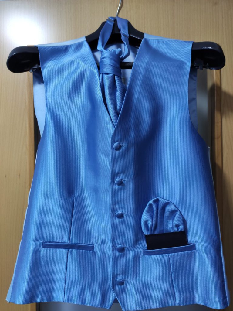 Chaleco, corbatón y pañuelo a juego azul celeste para novio o padrino.