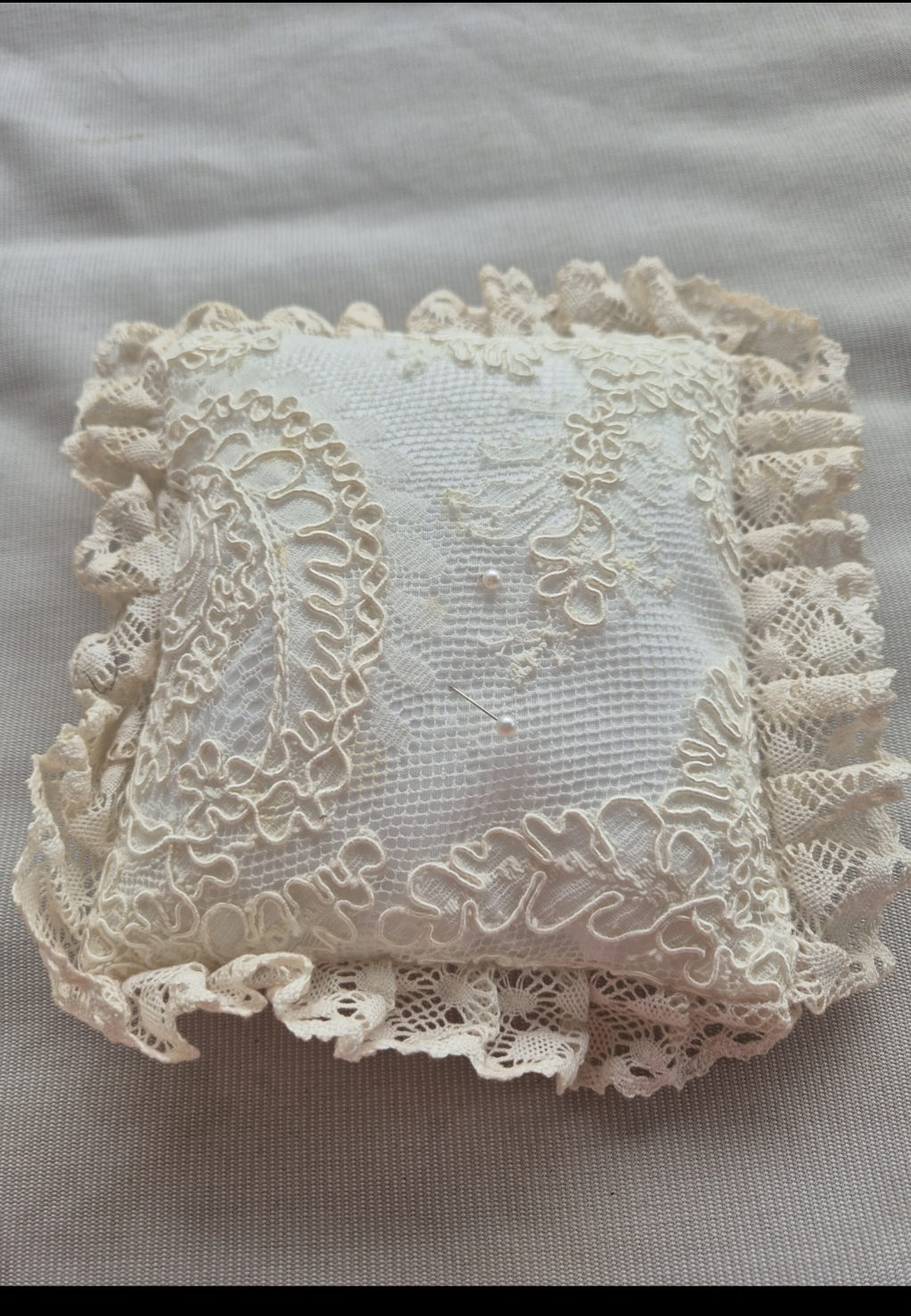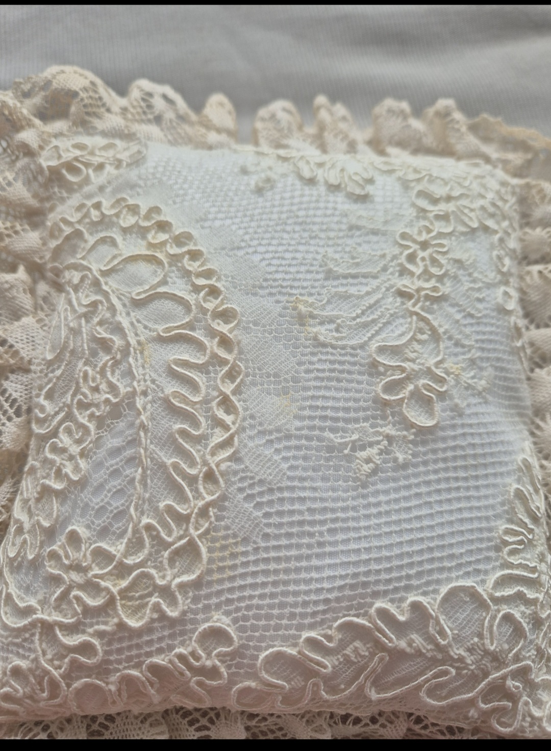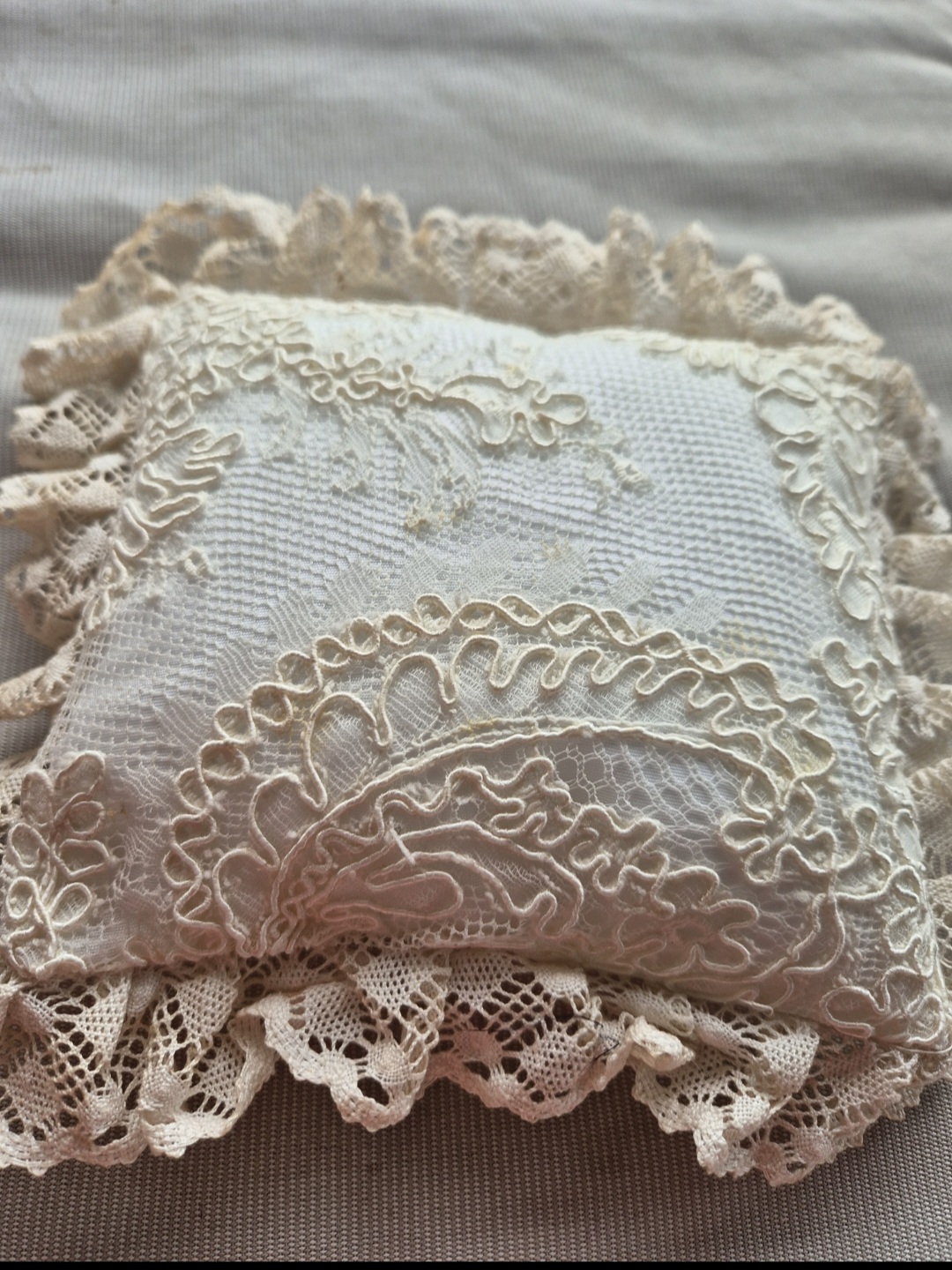 Es tracta d’un coixí brodat amb motius de flors. Fa 15×15. Estil francès i punta de coixí. Color crema.