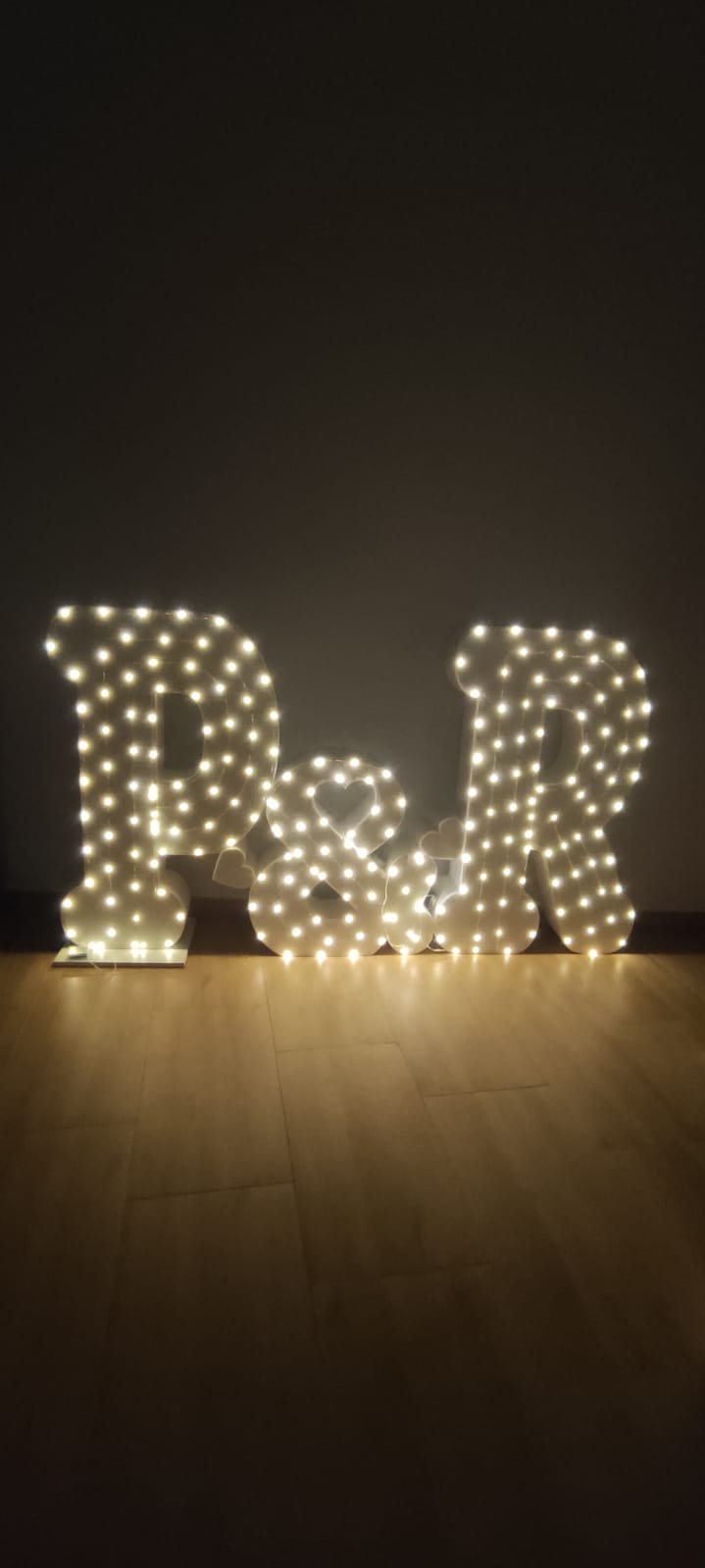 Letras de corcho P&R con iluminación led blanca. Miden 100cm de alto y están pegadas las 3 letras. Perfectas para una boda o evento.