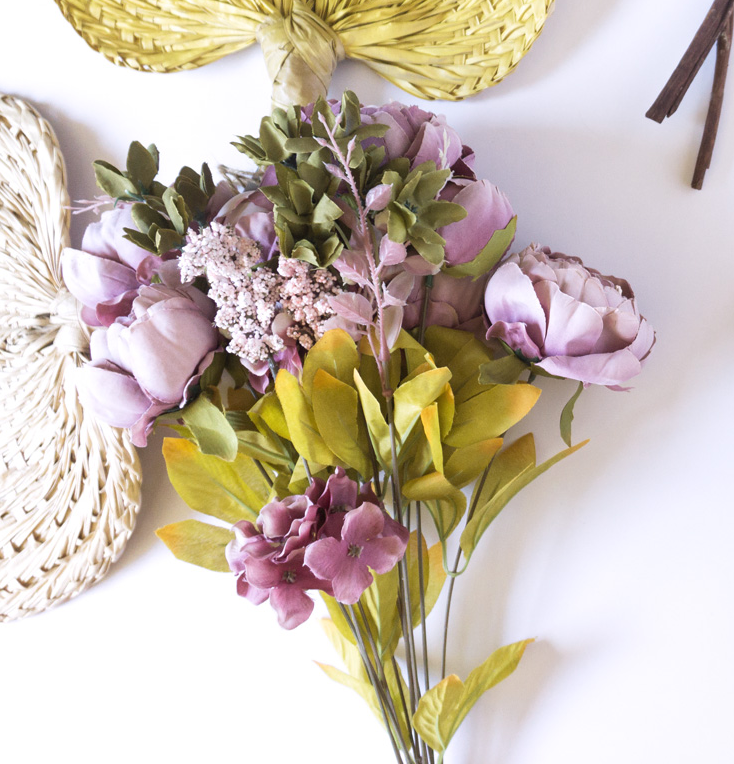 Ramo de peonías y tulipanes de color rosa. Están hechas de seda de plástico, con un acabado muy natural, parecen reales.