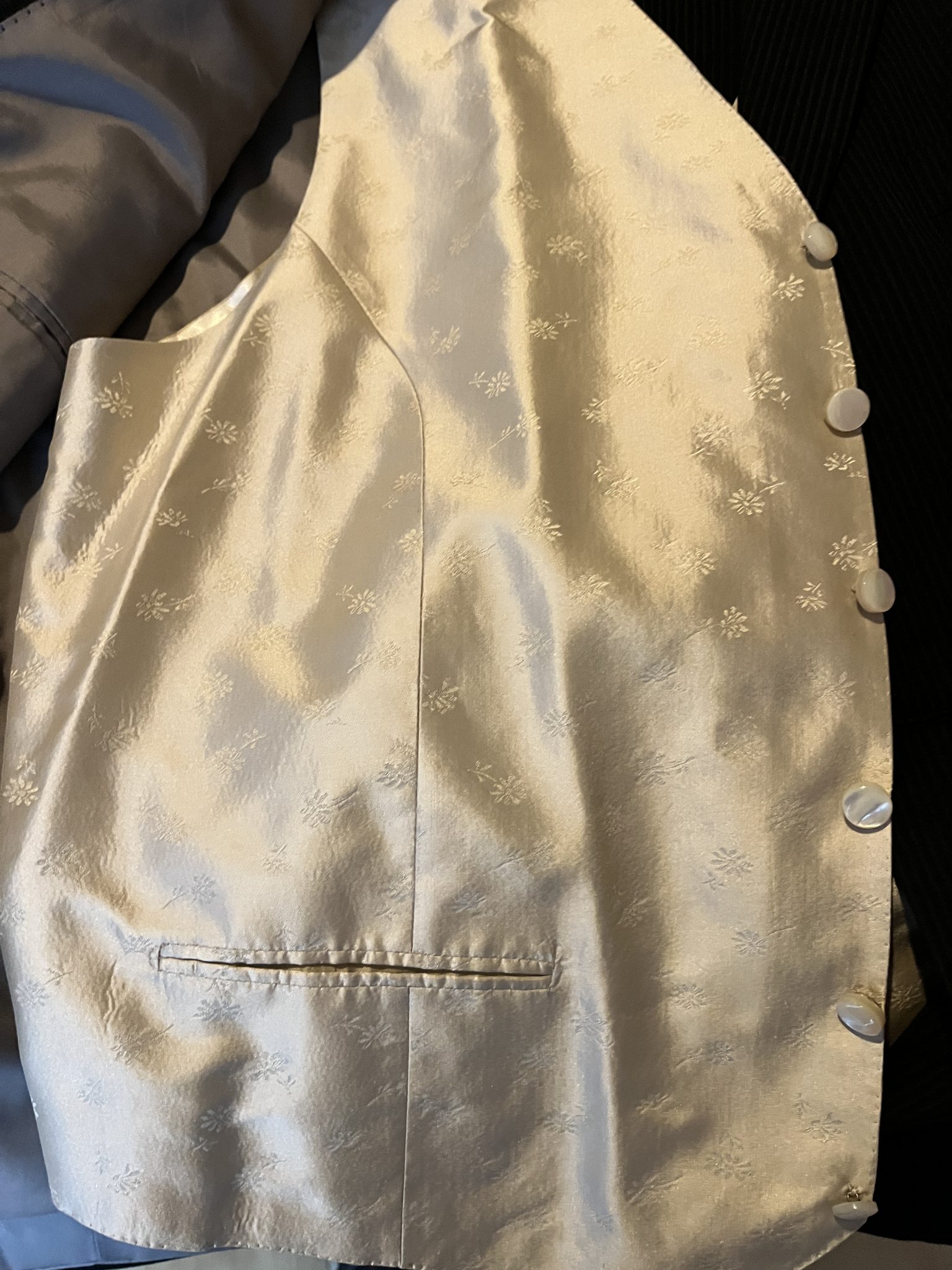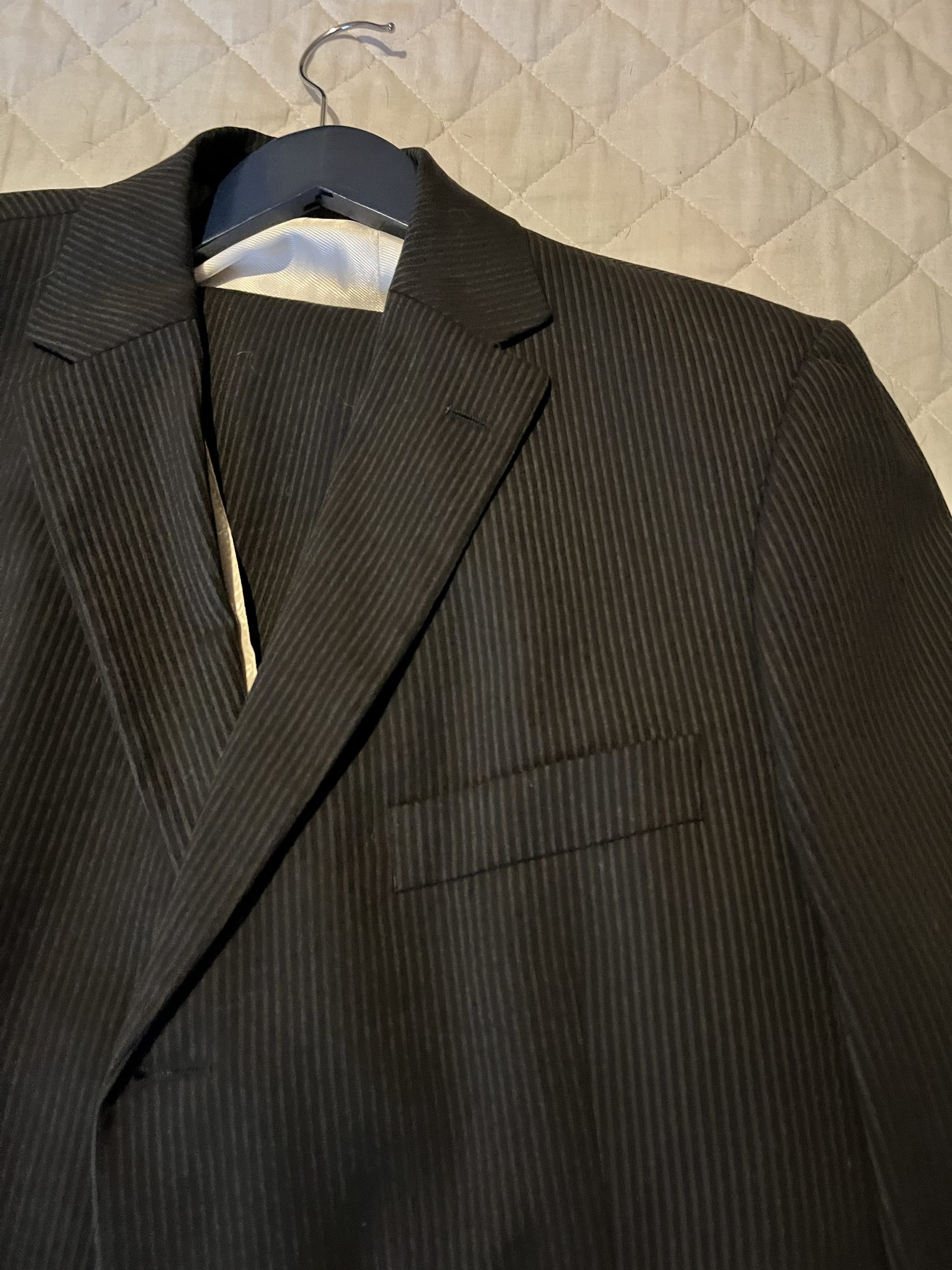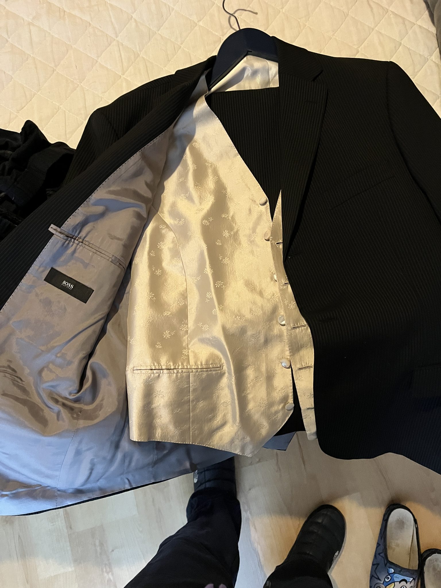 Traje Hugo boss negro con rayas grises y chaleco en beige.