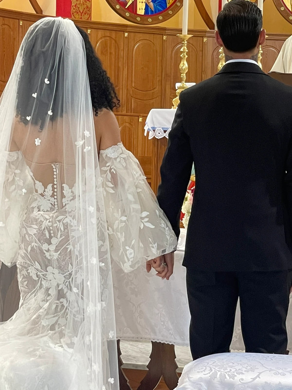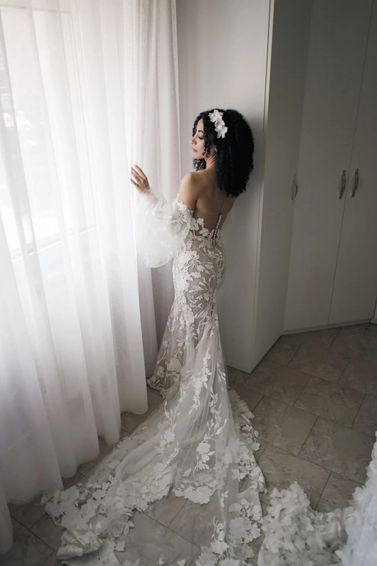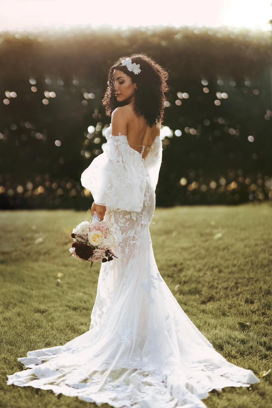 Vestido de novia sirena, cuerpo palabra de honor y escote corazón. Encaje floral bordado combinado con encaje chantilly y tul con purpurina. Cinturón con lazo, sastrería estilo lencero y cola de encaje festoneado. Además, mangas abullonadas separadas.