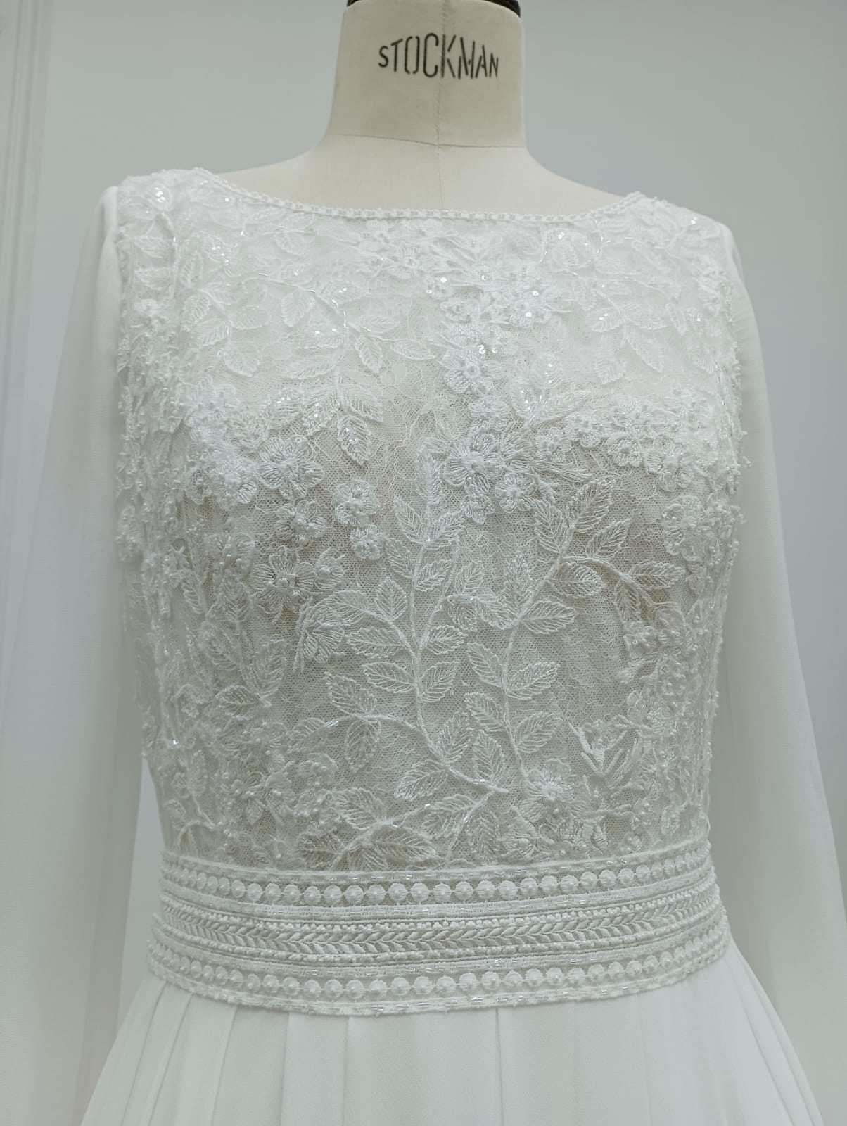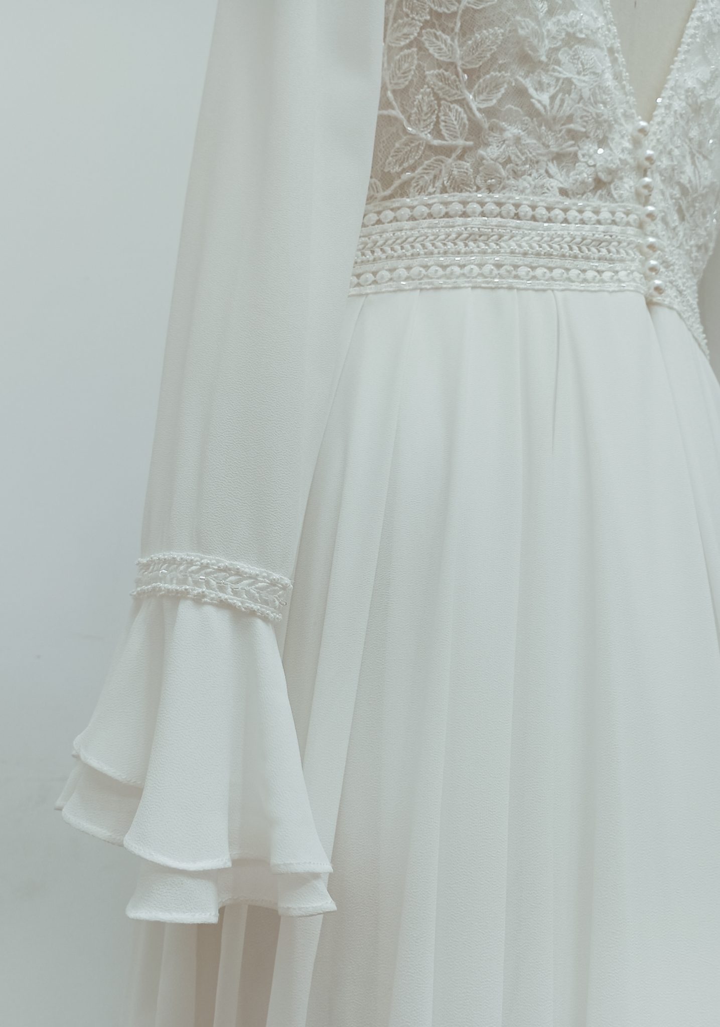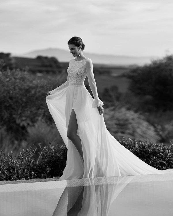 Vestido de novia, de corte recto y estilo fluido, confeccionado en georgette, encaje y pedrería. Luce un escote barco, una espalda en V, una manga larga y una falda con abertura delantera, que combinan de maravilla. Colección Rosa Clará Boheme.