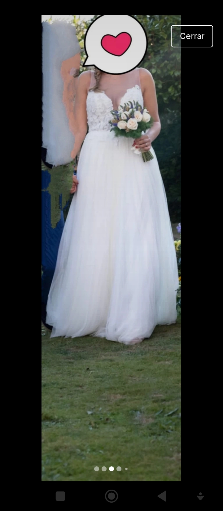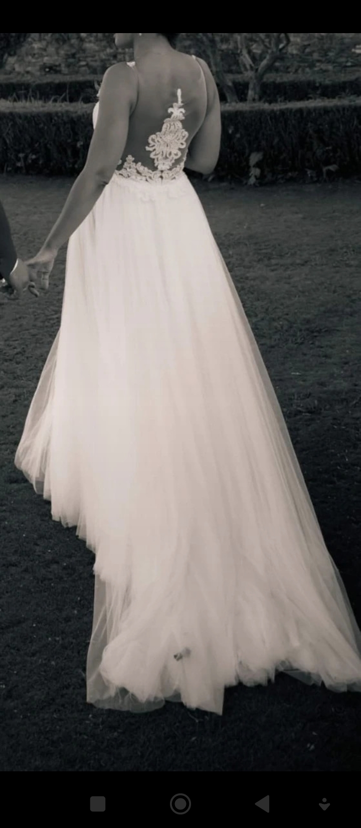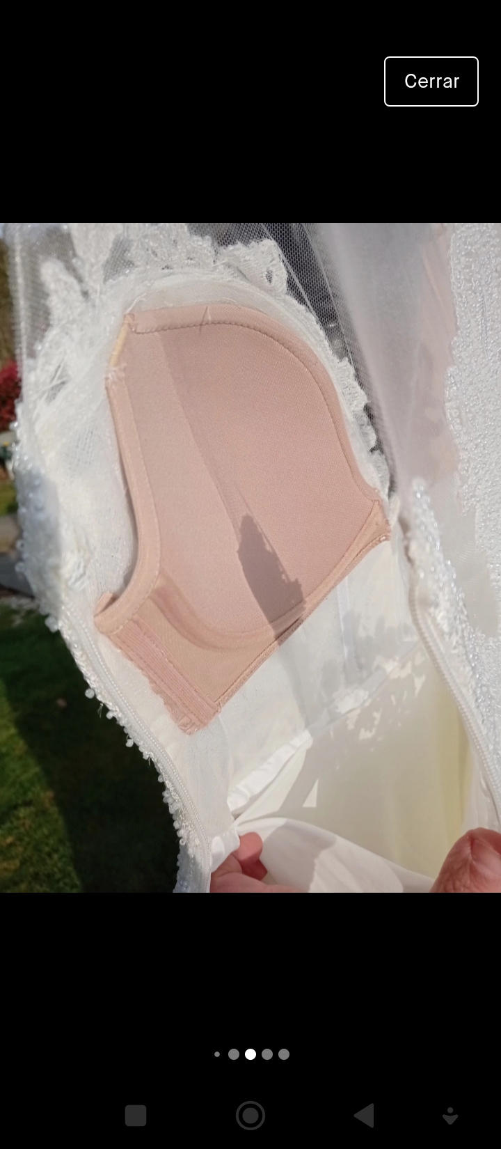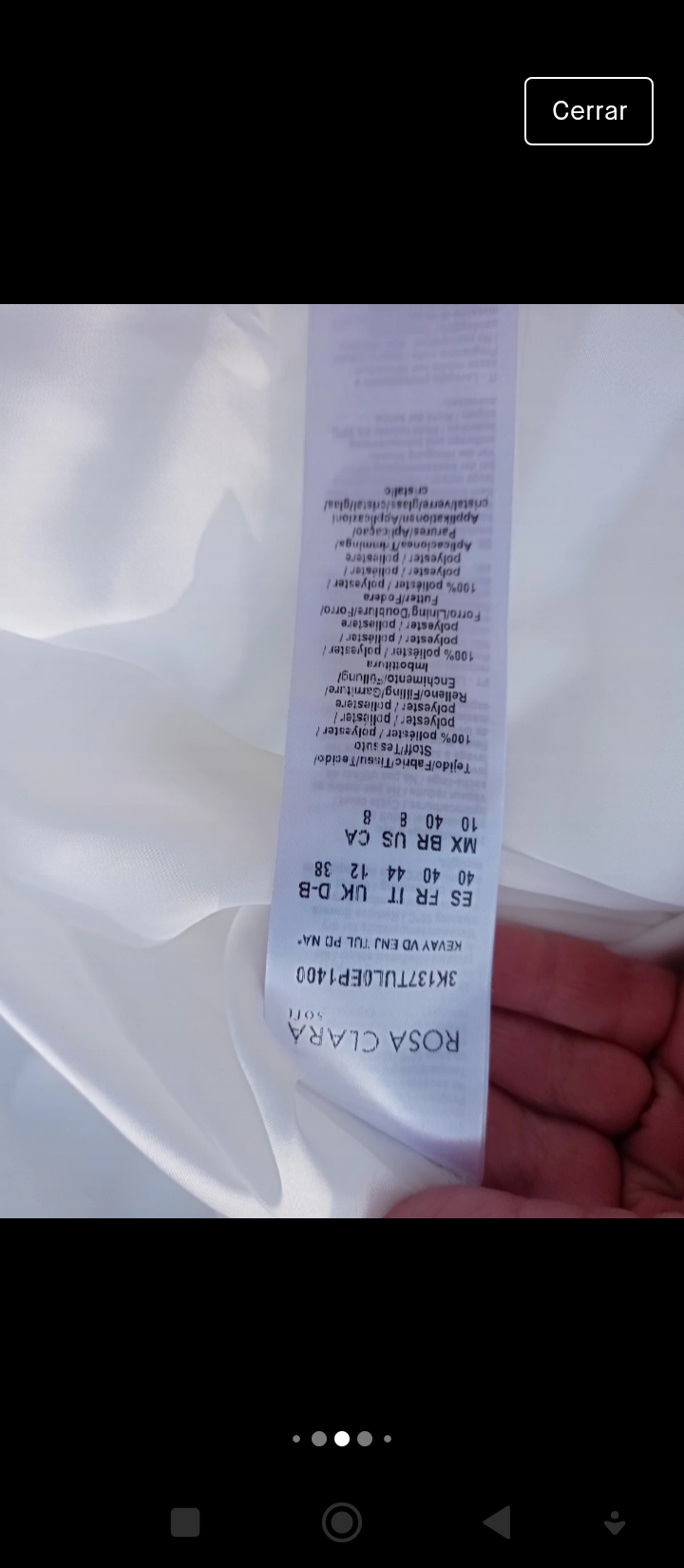 talla 40, se le adapto en sisa y pecho para una talla 95,va con combinación incluida cosida al vestido para que no se pueda mover y verse con las transparencias y pedrería de la espalda y cazuelas cosidas al vestido,por el mismo motivo, se pueden descoser fácilmente.falda de tul.todas estas modificaciones de realizaron en la tienda de rosa clará por su modista.Modelo keyva,colección soft rosa clara 2019. Incluye funda porta trajes original. Precio original del vestido 1900 + combinación.