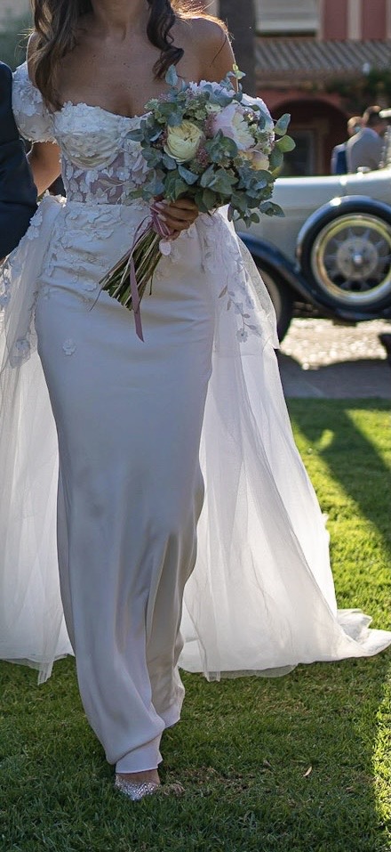 Escote palabra de honor estilo corset de tul con flores en 3d,trae copas integradas. Falda corte al bies, lleva sobrefalda y manguitos de quita y pon con posibilidad de combinar al gusto, ambos de tul con flores en 3d. Precio original 3.000