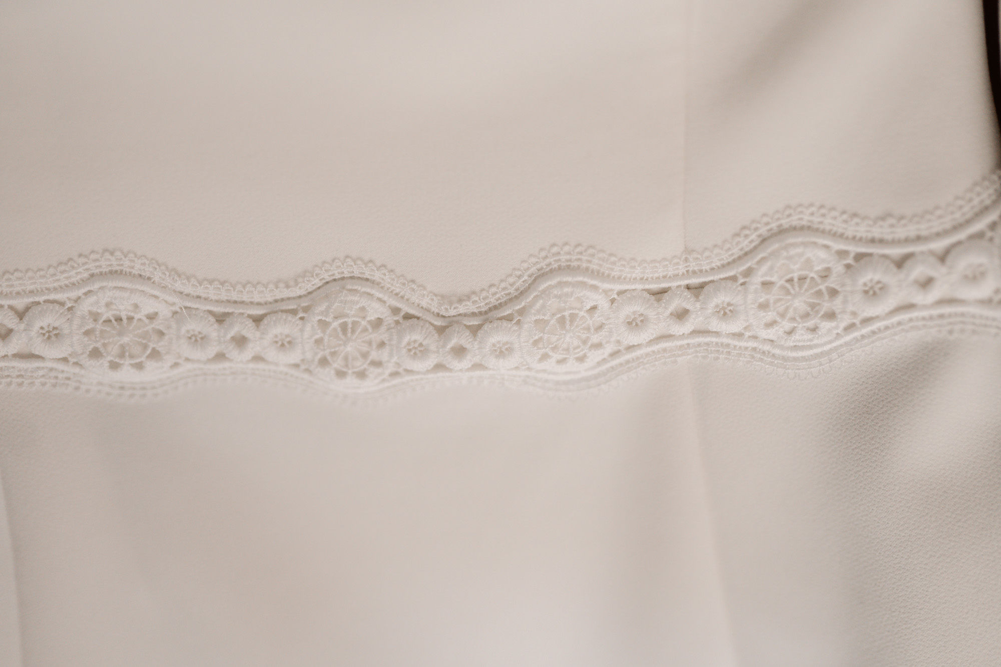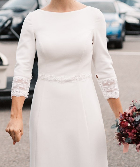 Vestido de novia, modelo DONNA de la diseñadora Silvia Fernández. Vestido en crep de líneas rectas, espalda plumeti de algodón y manga francesa con mismo remate. Escote en barco. Detalle cenefa de flores a la altura de la cintura, falda con caída y movimiento y cola fluida. Talle 38, medidas pecho (83cm), Cintura (68 cm) y cadera (90cm). Se puede adaptar fácilmente a las medidas exactas con un pequeño arreglo. Altura 1.58 cm con tacón 8 cm.