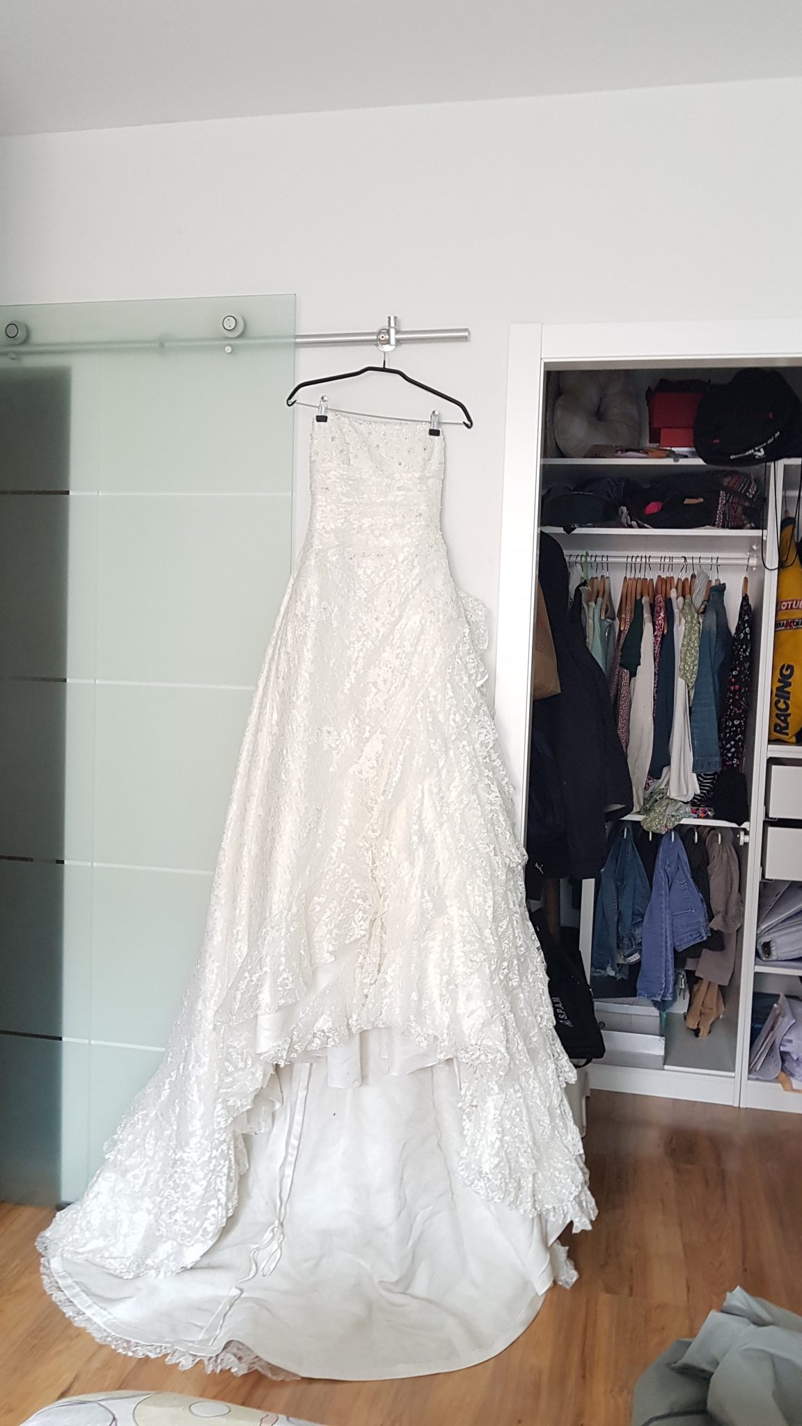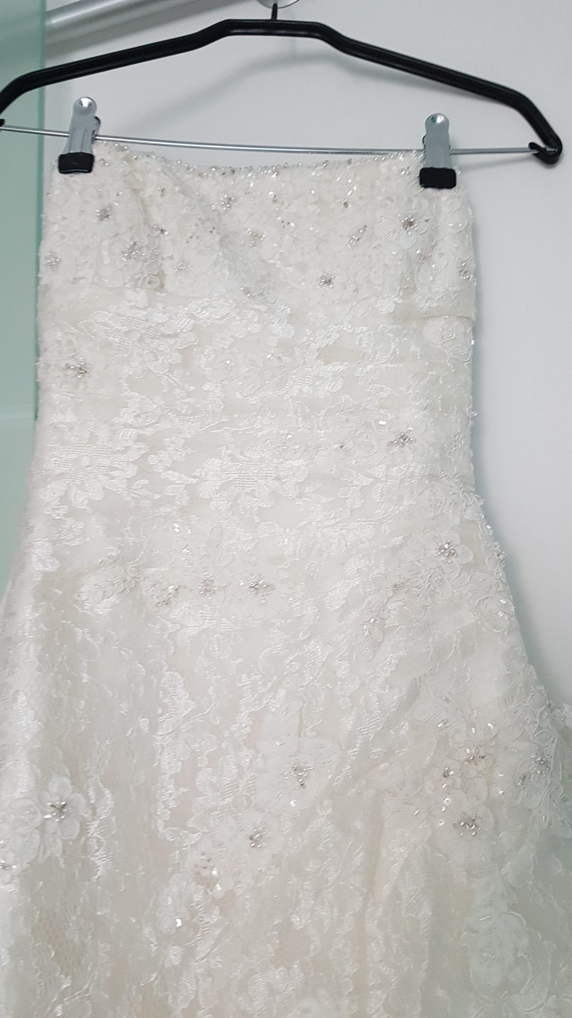 Vestido de Novia La Sposa palabra de honor, encaje y pedrería. Tanto la tela como la confección son de excelente calidad. No tiene manchas ni rotos, está lavado, pero habria que llevarlo a la tintorería para repasar el bajo. Perfecto Estado.