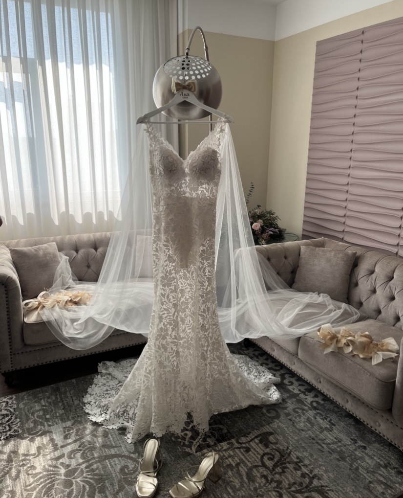 Vestido Teana Rosa Clará 2022, puesto solo para la ceremonia (ya que llevé un segundo vestido para la barra libre) Talla 38. Medidas: Pecho 95 Cintura 74 Cadera 105. Tiene costura para poder sacarle un poco. También se puede hacer más pequeño en una modista. El velo también está incluido. Factura original, me costó 2700 euros. Tela de guipur y velo de seda.